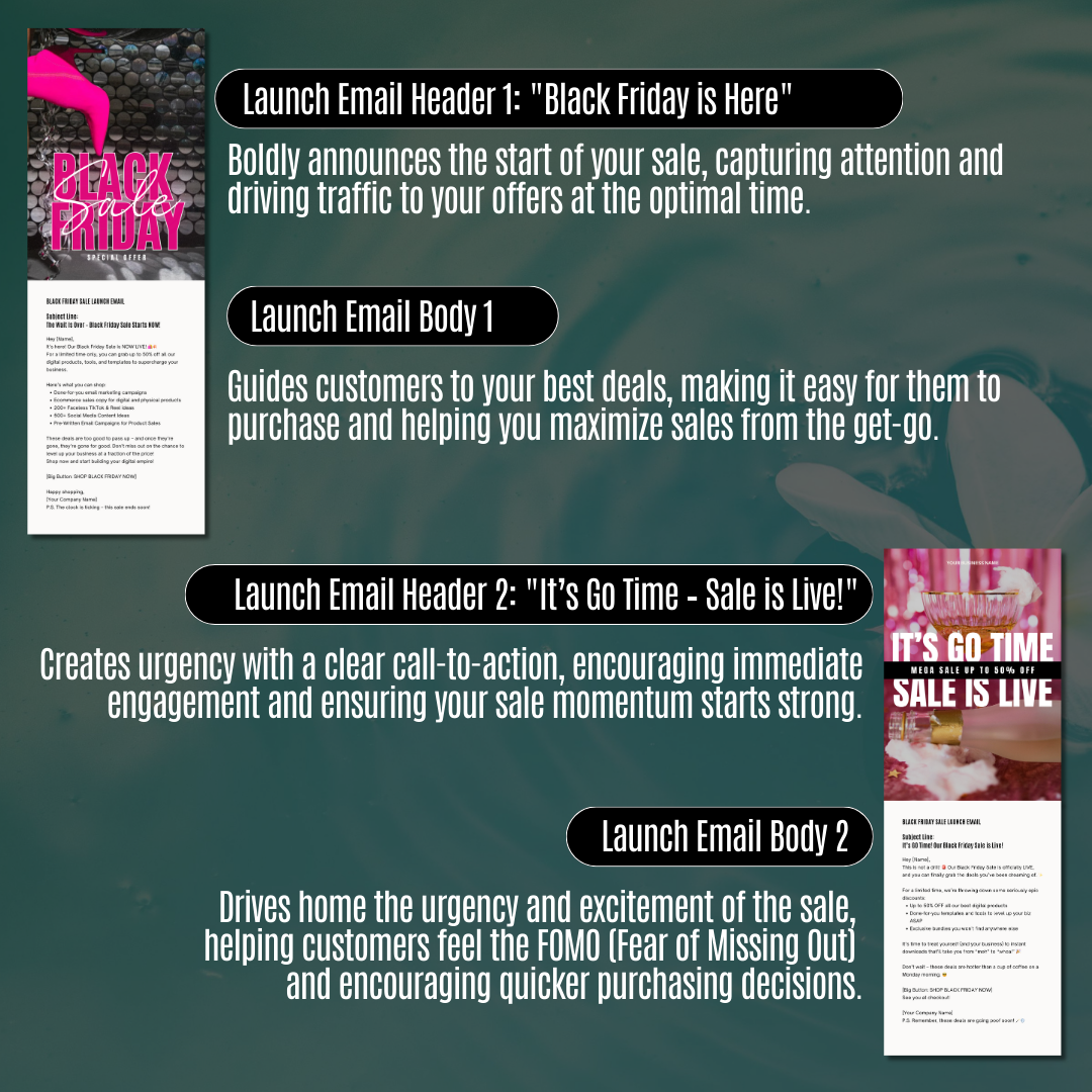 This Black Friday Email Marketing Sequence is more than just a set of templates—it’s your comprehensive strategy for driving engagement and maximizing sales every step of the way.