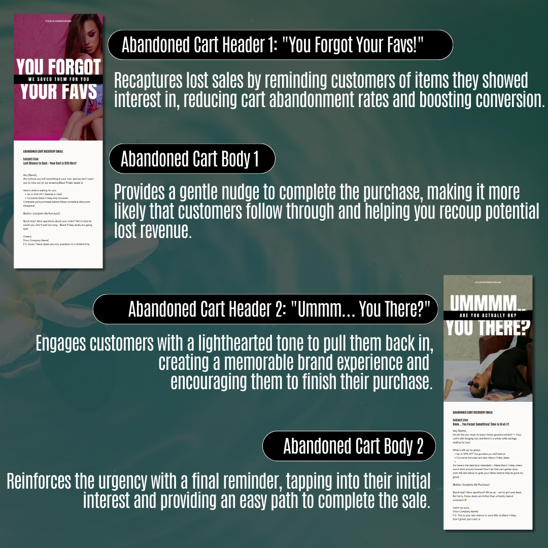 Capture missed opportunities with gentle, friendly reminders that bring back cart abandoners. Messages like "Did You Forget Something?" and "Your Favorites Are Waiting!" encourage customers to complete their purchases and keep your sales on track.