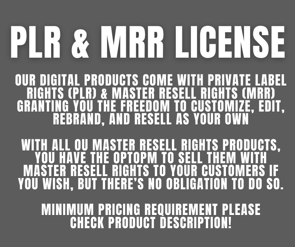 Our digital products come with Private Label Rights (PLR) & Master Resell Rights (MRR) granting you the freedom to customize, edit, rebrand, and resell as your own.